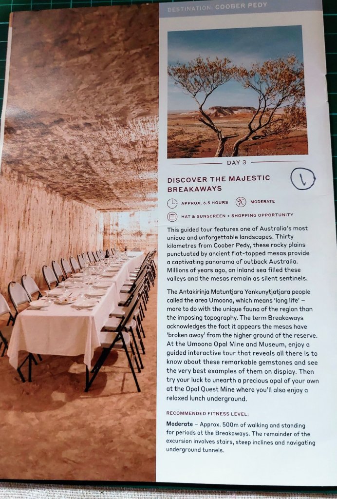 When booking to travel on the Ghan you have two options: Adelaide to Darwin 3 days 2 nights or Darwin to Adelaide 4 days 3 nights. I chose the second option and extra time because you get to visit Coober Pedy. I have watched several travel documentaries on TV about Coober Pedy, opal mining and living and working conditions. This location was on my bucket list and I am so happy I achieved this, it was the highlight of my holiday. We not only saw the amazing landscape but also got to go underground, learn about the opal mining.