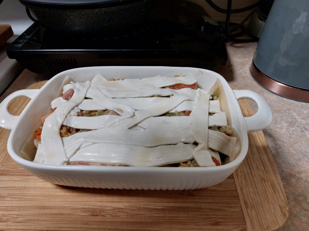 I partially cooked some pastry so the pie wouldn’t have a soggy bottom 😀. I then added the leftovers from yesterday plus some diced fresh salmon and then decorated the top with remaining pastry. Baked at 180 degrees Celsius for about 25 minutes.