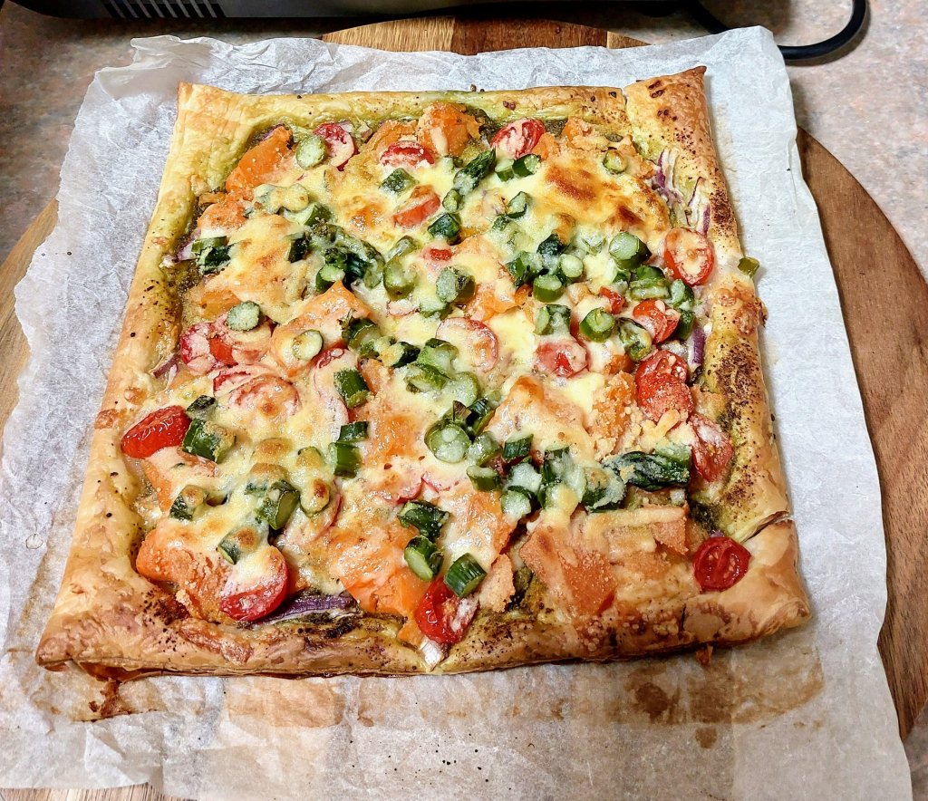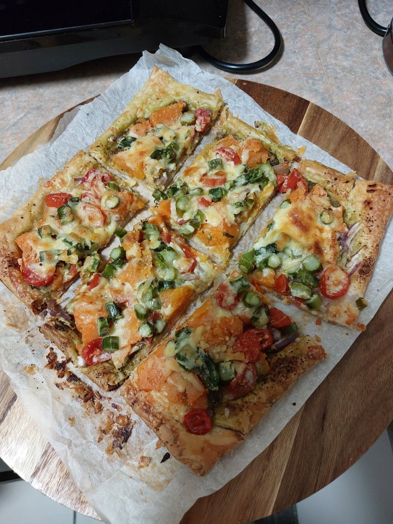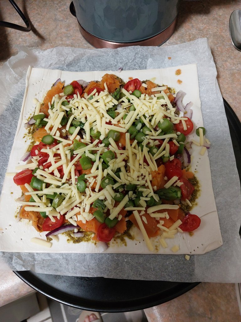 Place a sheet of pastry onto a lined baking tray. Spread with pesto and then add thinly sliced red onion , diced Cherry tomatoes, cooked left over sweet potato, blanched asparagus and grated cheese. Bake in oven 200 degrees Celsius for about 20 minutes or until the pastry is cooked to your liking.