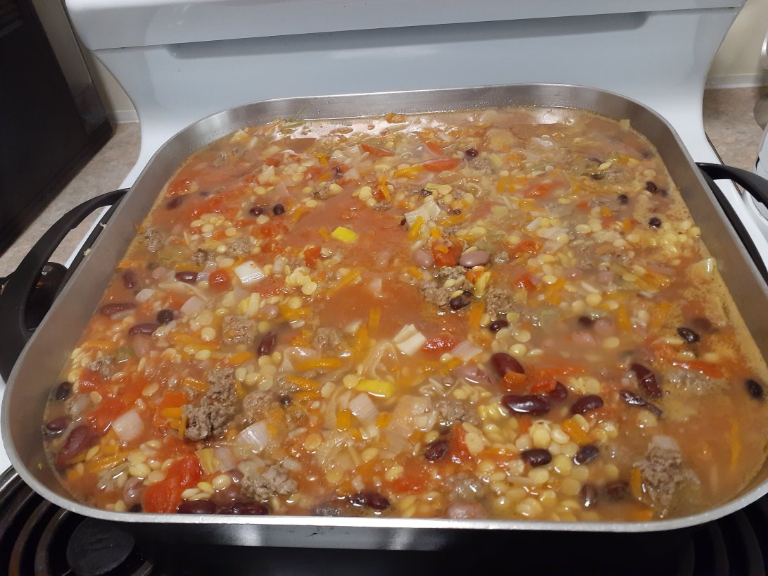 Chopped up leeks and celery Grated carrots and sweet potato A tin each of diced tomatoes and Mexican three Bean mix 2 cups of cooked lentils. I also added some powdered corriander, turmeric and roasted cumin. I am not keen on too much spice or chilies. I then added enough water to cover and then simmered it for 45 minutes.