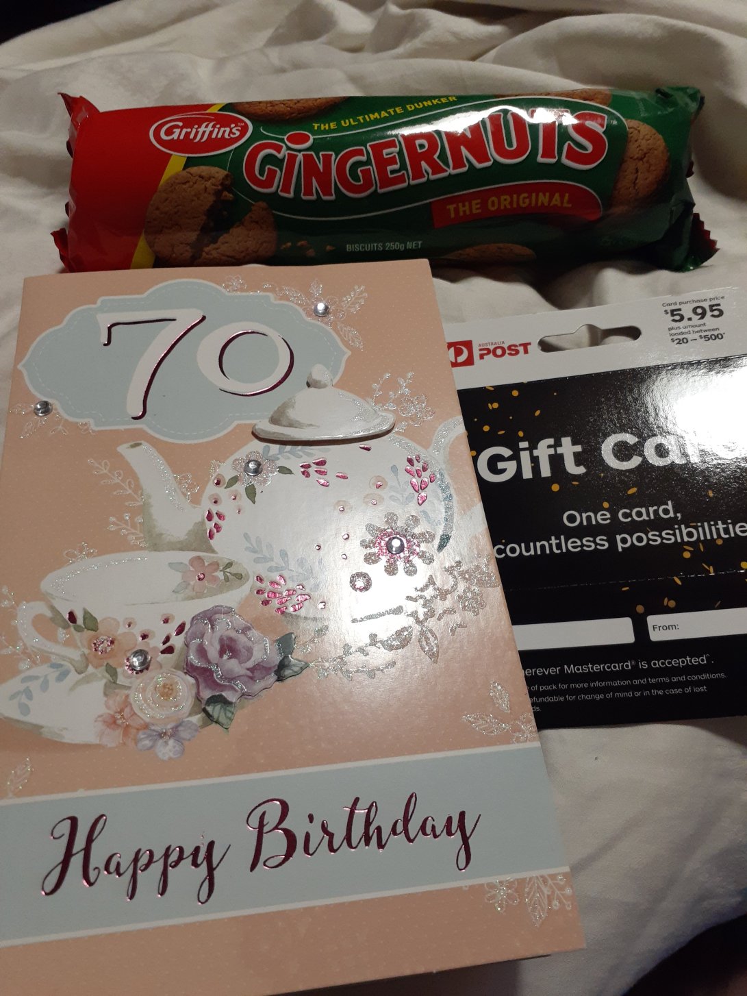 My son posted me a monetary gift card and a packet of Gingernuts. The gingernuts are a kiwi brand that he knows I like, so does he and his beautiful wife….they are really yummy