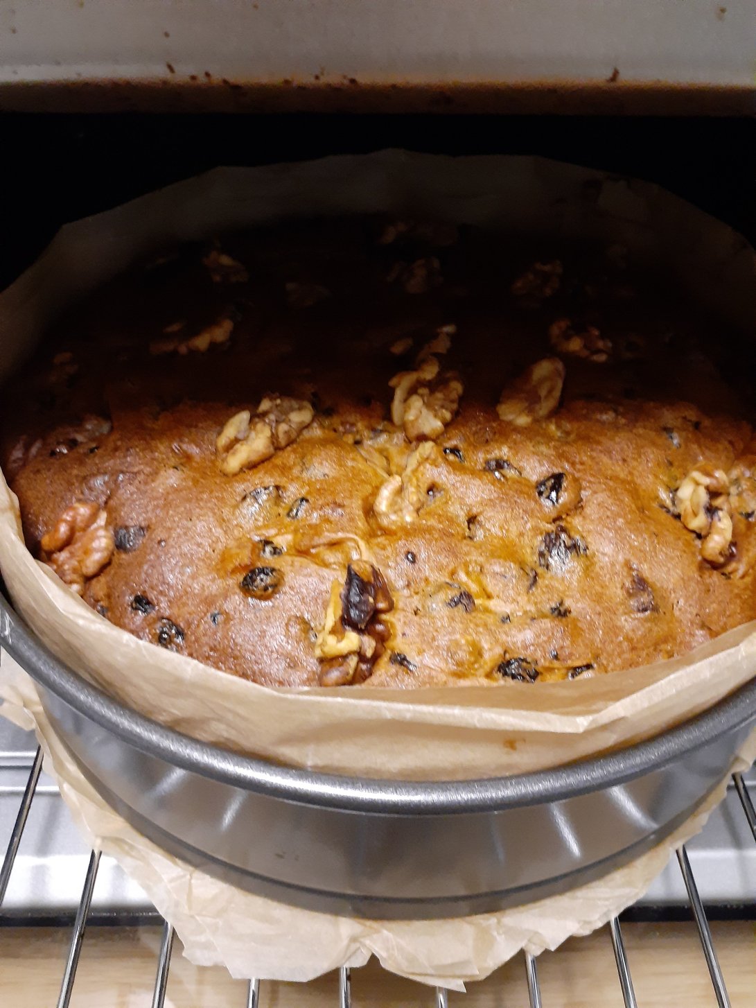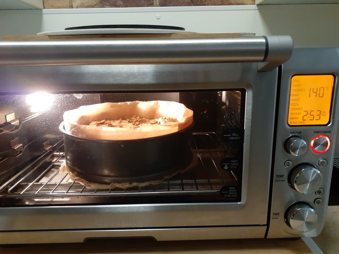 I mixed all the ingredients according to the recipe, real easy to do. I then carefully spooned the mixture into the tin. I placed a few walnuts on top.