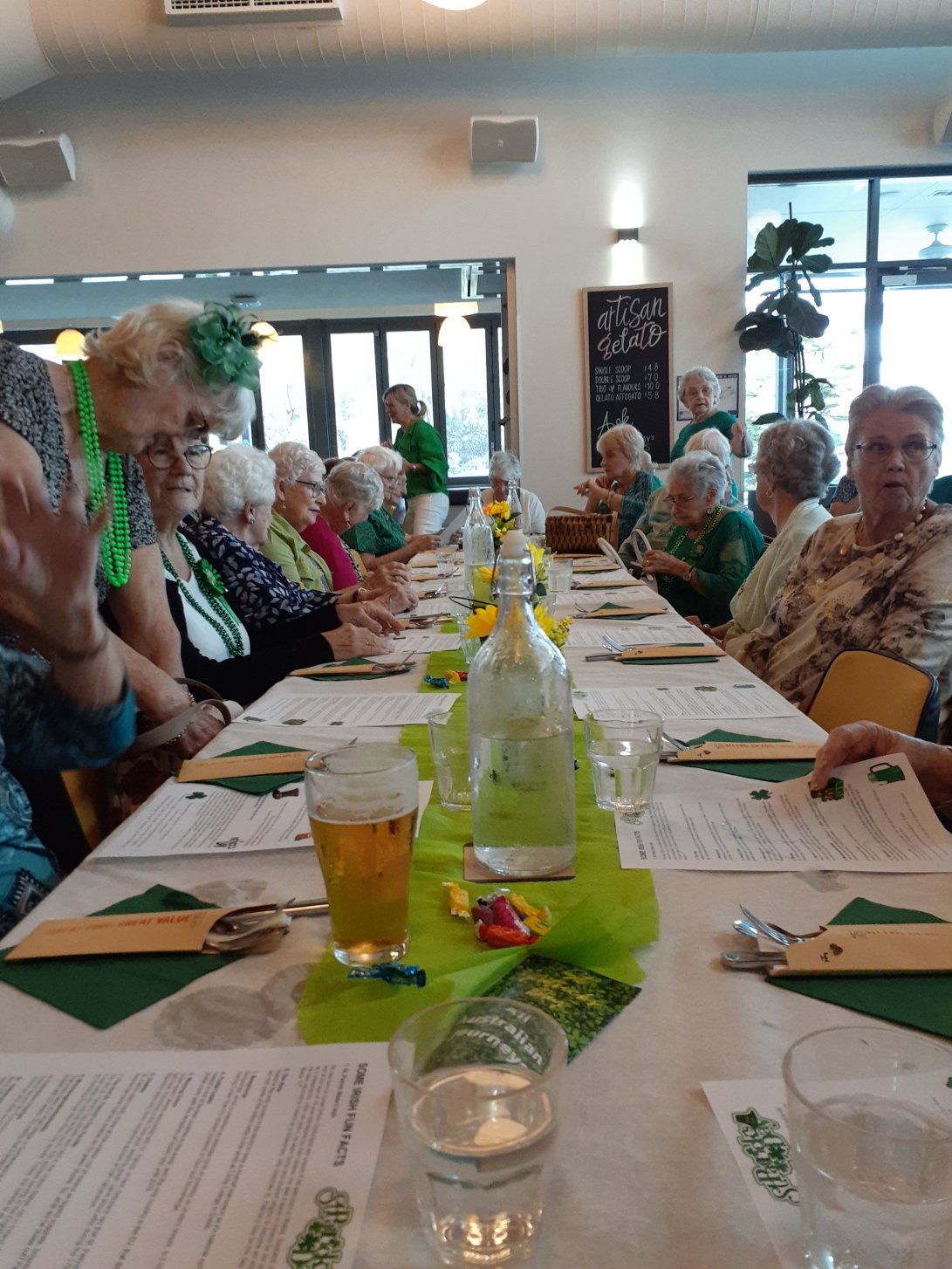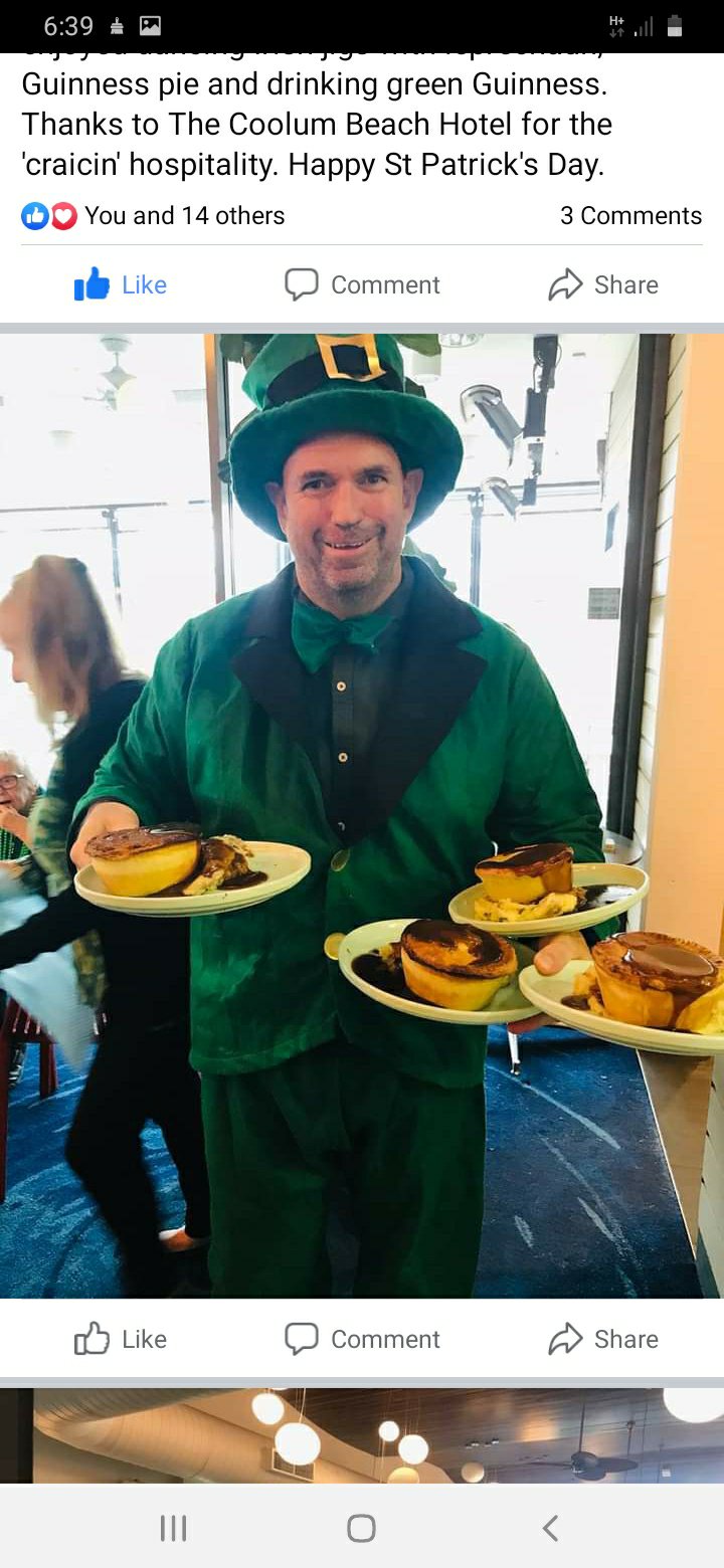 Our venue was Coolum Beach Hotel. The rain didn’t stop for anyone, we managed to get inside without getting drenched. βπ.There were two hundred of us for the function, 4 tour buses and also a charter bus.The hotel was decorated up for St Patrick’s day. I managed to sit at the of a table, better than being squashed in, and of course no social distancing.