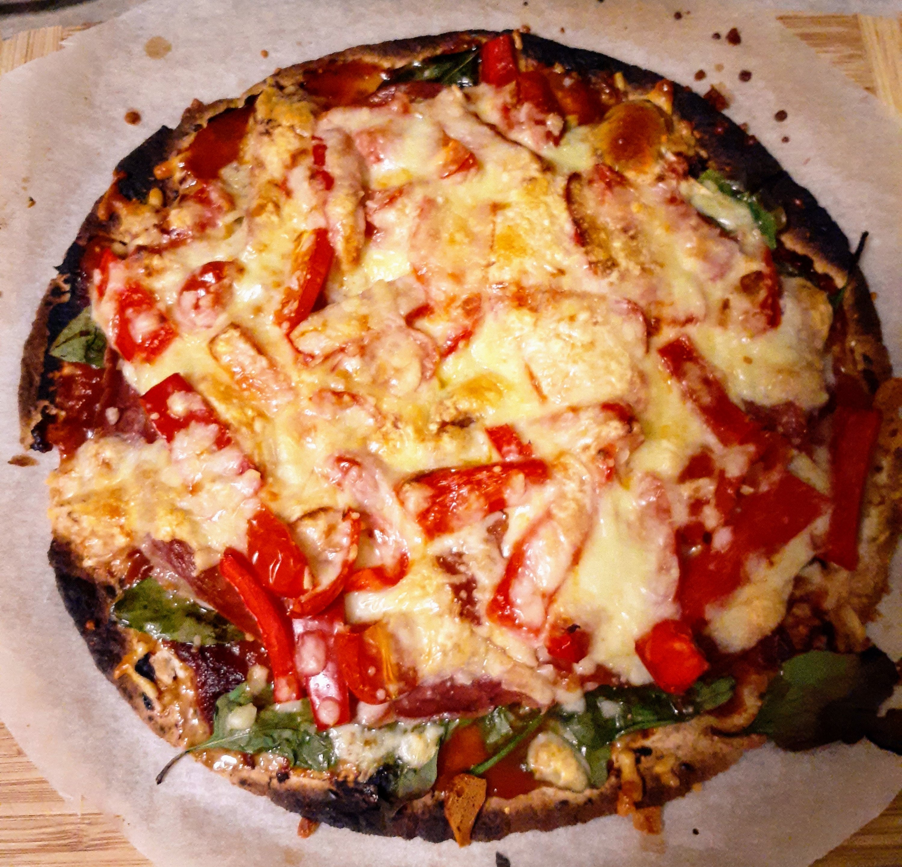 Mixed Grain Wrap , tomato paste, baby spinach, beef and salami slices from the deli, red capsicum, cherry tomatoes and grated cheese. Bake at 210 c for 14 minutes.
